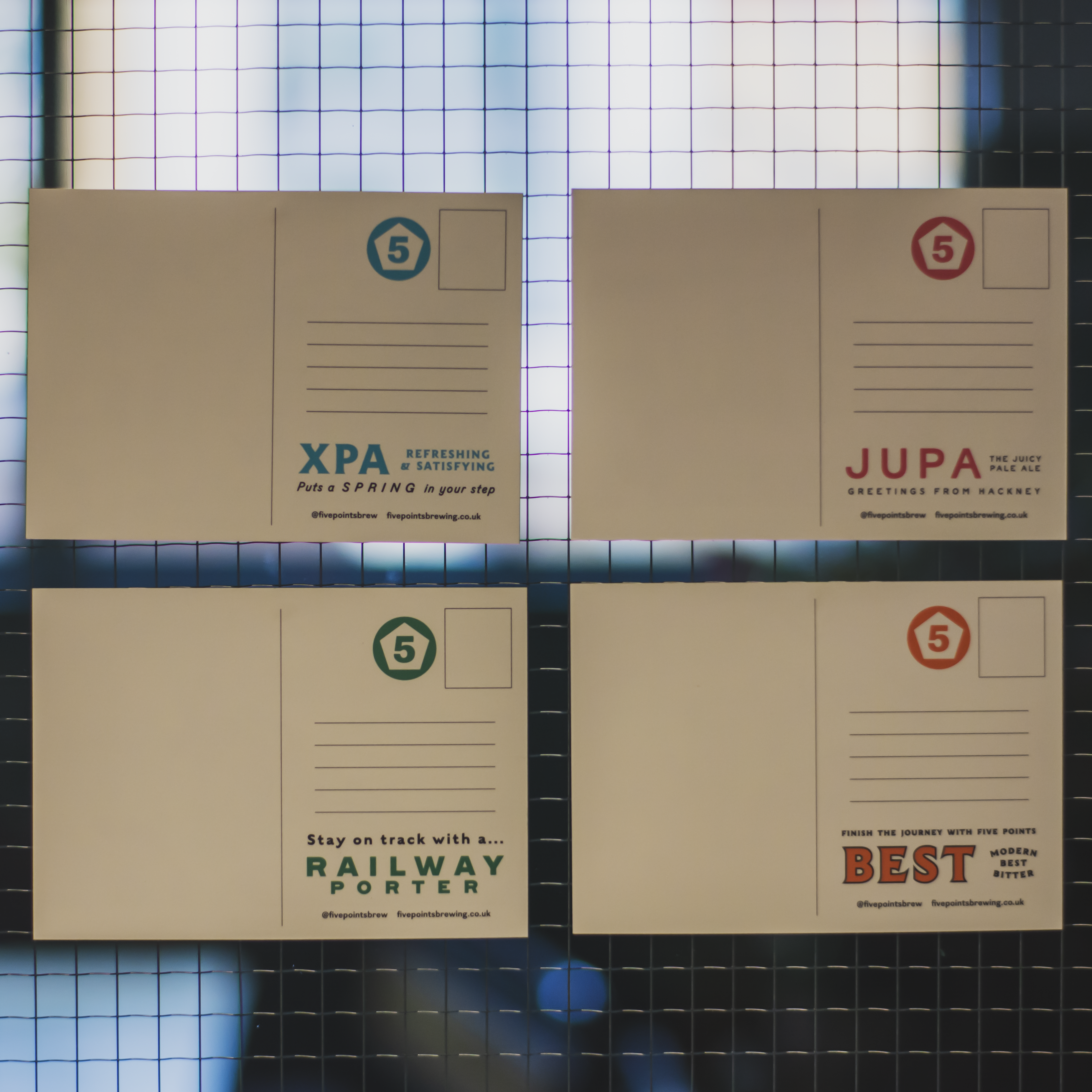The backs of the cards feature a tagline for the featured beer relating to the artwork: Five Points Best, Five Points XPA, Railway Porter and Five Points JUPA. There's plenty of space to use these for correspondence, and the correspondence side is matte, so easy to write on without any smudges.